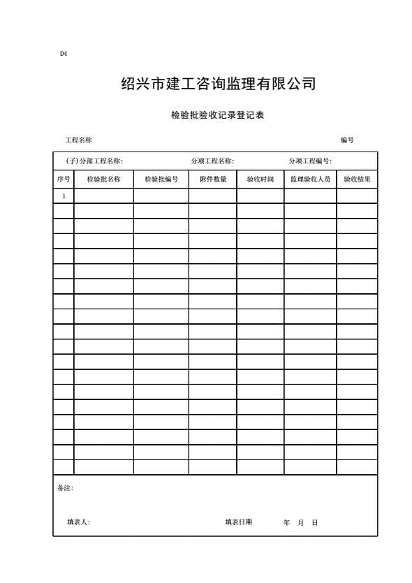 表格名称:D4检验批验收记录登记表