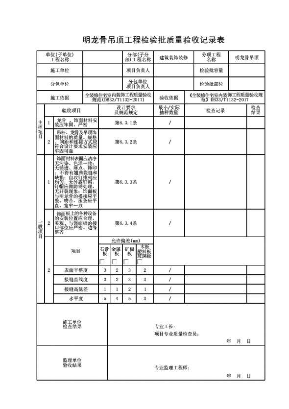 表格名称:明龙骨吊顶工程检验批质量验收记录表
