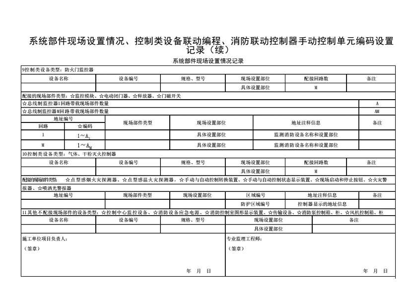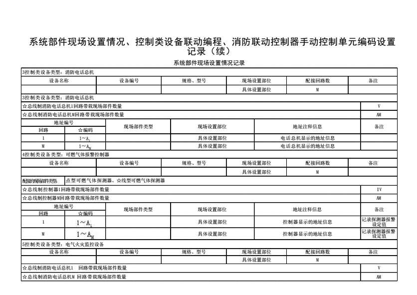 表格名称:系统部件现场设置情况、控制类设备联动编程、消防联动控制器手动控制单元编码设置记录