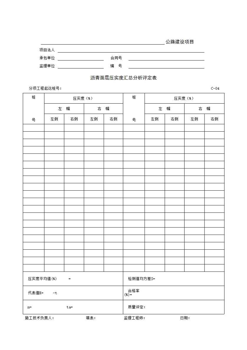 表格名称:C-04 沥青面层压实度汇总分析评定表