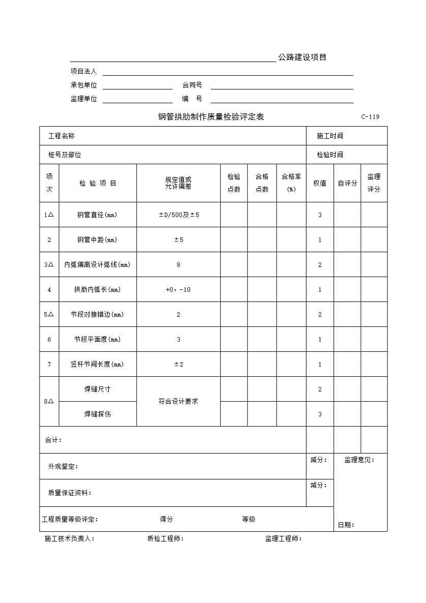 表格名称:C-119 钢管拱肋制作质量检验评定表