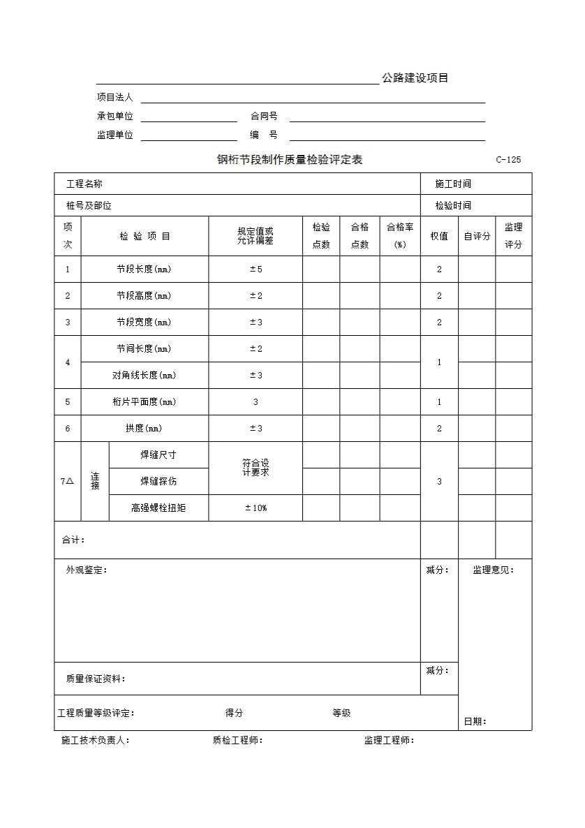 表格名称:C-125 钢桁节段制作质量检验评定表