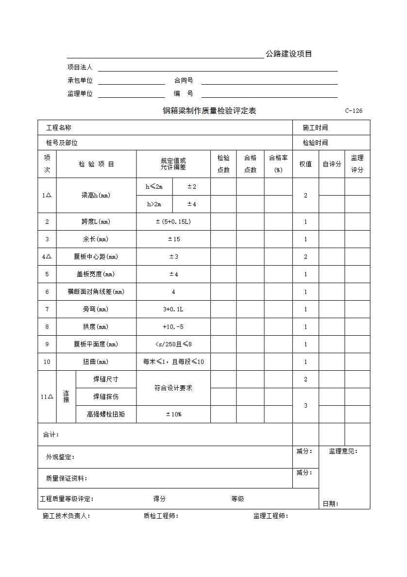 表格名称:C-126 钢箱梁制作质量检验评定表