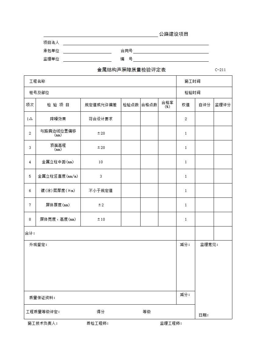 表格名称:C-211 金属结构声屏障质量检验评定表