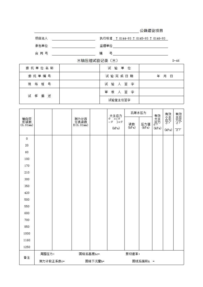 表格名称:D-46 三轴压缩试验记录(三)