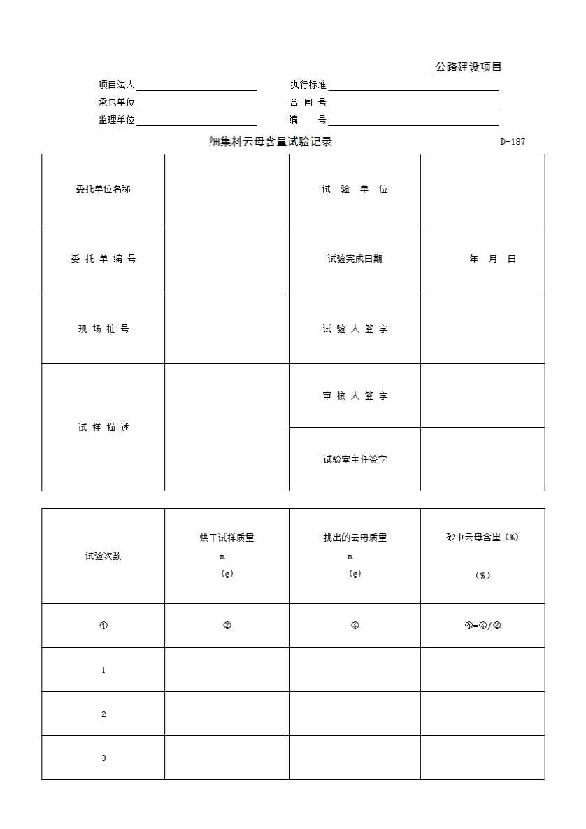 表格名称:D-187 细集料云母含量试验记录