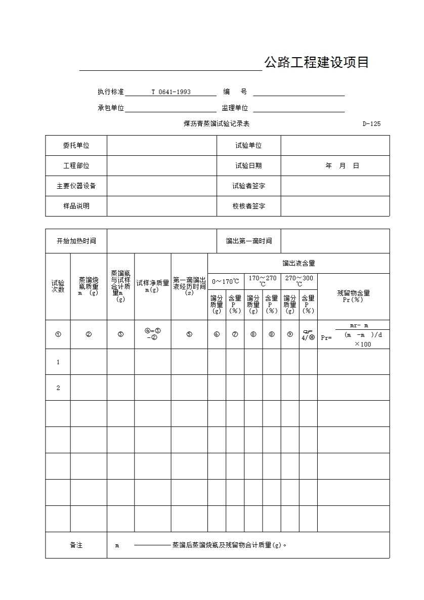 表格名称:D-125 煤沥青蒸馏试验记录表