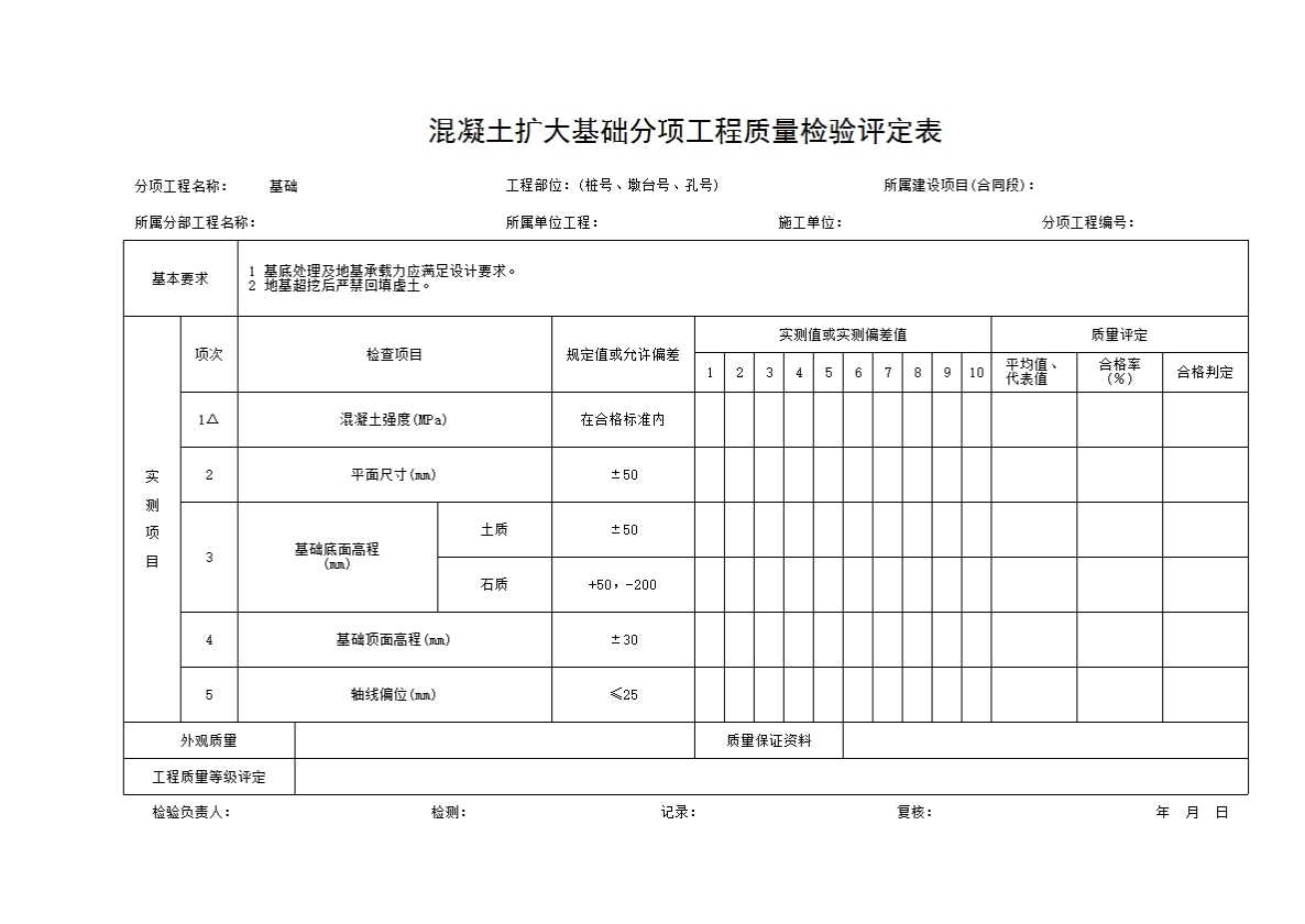 表格名称:混凝土扩大基础分项工程质量检验评定表