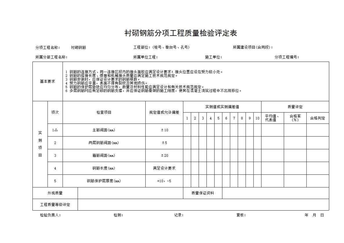 表格名称:衬砌钢筋分项工程质量检验评定表