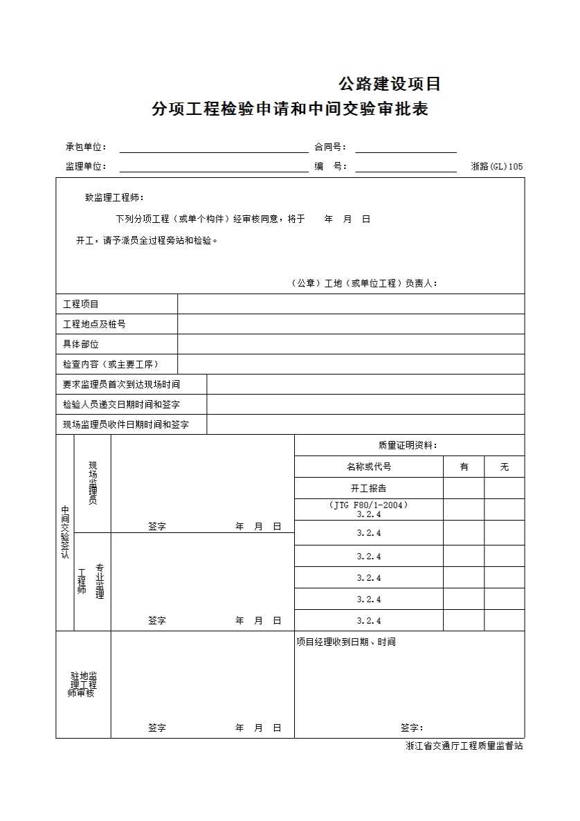表格名称:GL105分项工程检验申请和中间交验审批表