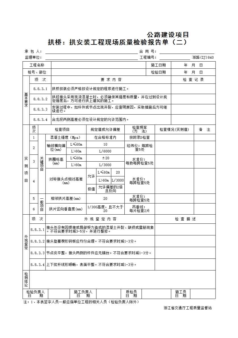 ZJ840拱桥:拱安装工程现场质量检验报告单(二)