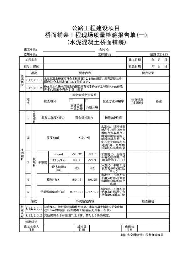 表格名称:(ZJ)893 桥面铺装工程现场质量检验报告单(一)(水泥混凝土桥面铺装)
