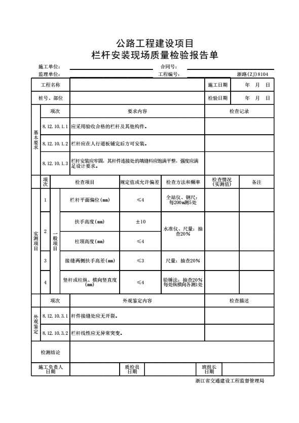 表格名称:(ZJ)8104 栏杆安装现场质量检验报告单