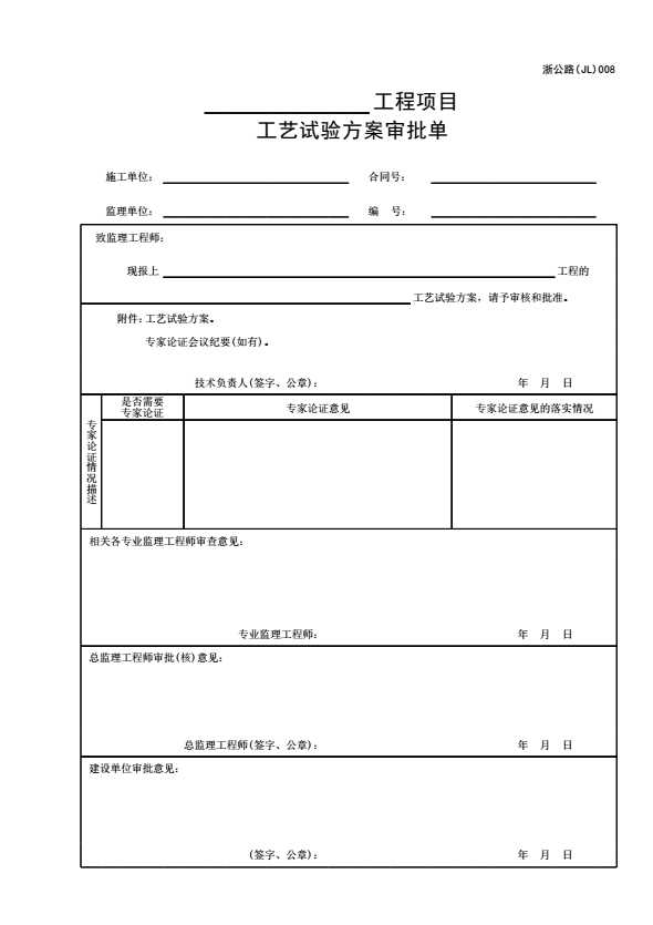 表格名称:浙公路(JL)008 工艺试验方案审批单