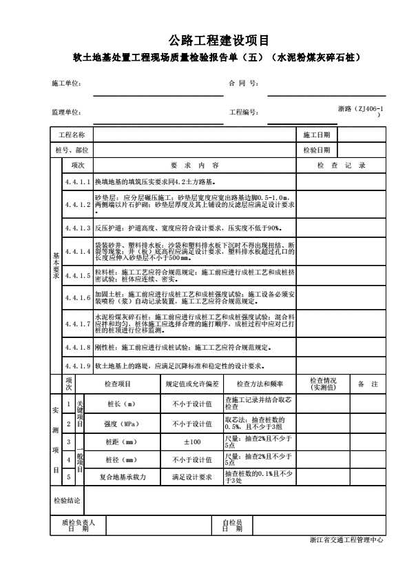 ZJ406-1 软土地基水泥粉煤灰碎石桩工程现场质量检验报告单