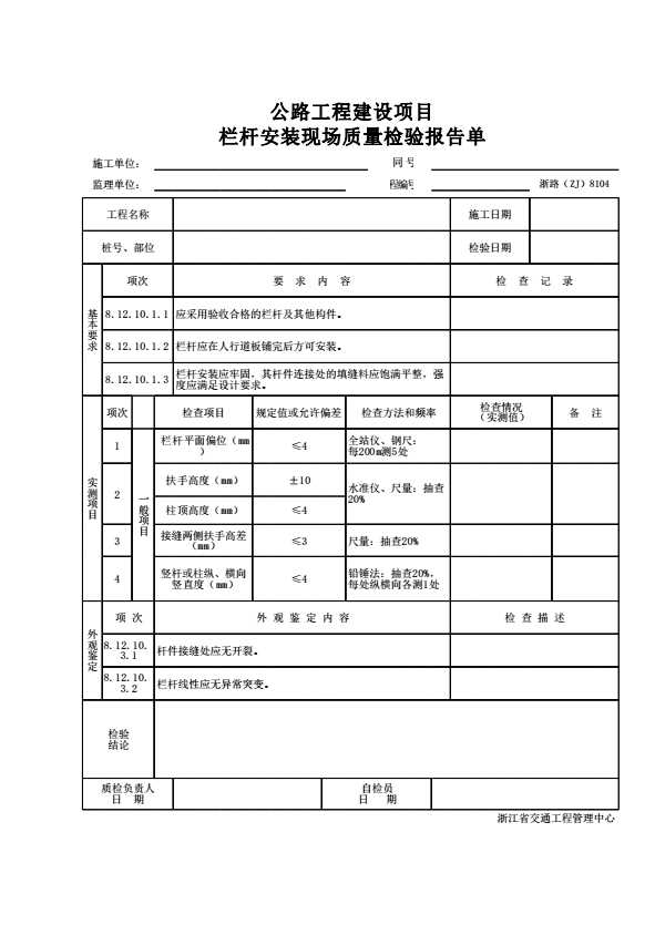 表格名称:ZJ8104 栏杆安装现场质量检验报告单
