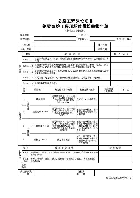 ZJ855 钢梁防护涂装现场质量检验报告单