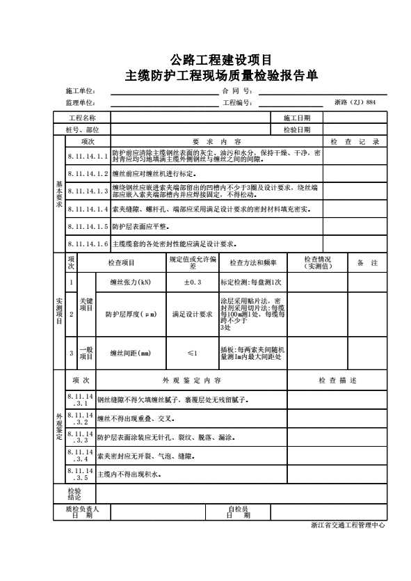 表格名称:ZJ884 主缆防护现场质量检验报告单