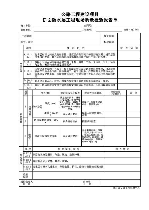 表格名称:ZJ892 桥面防水层工程现场质量检验报告单