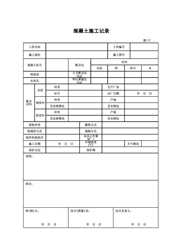 表格名称:建-17 混凝土施工记录