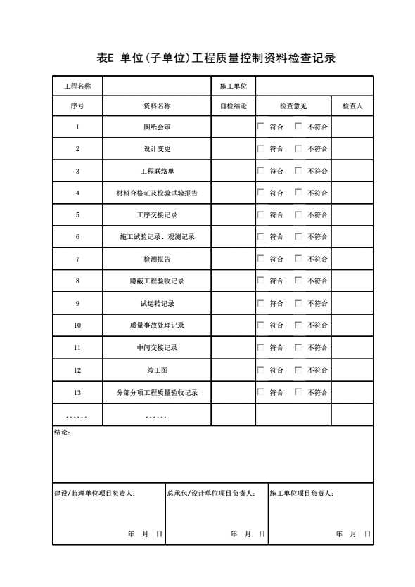 表格名称:表E 单位(子单位)工程质量控制资料检查记录
