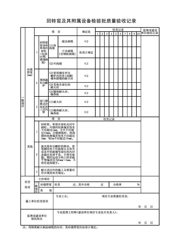 表格名称:回转窑及其附属设备检验批质量验收记录