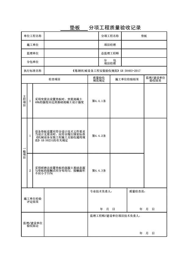 表格名称:垫板分项工程质量验收记录