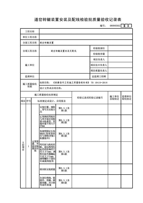 表格名称:08090502 道岔转辙装置安装及配线检验批质量验收记录表