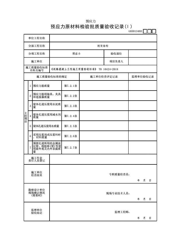 表格名称:G03013403 【预应力】预应力原材料检验批质量验收记录(Ⅰ)
