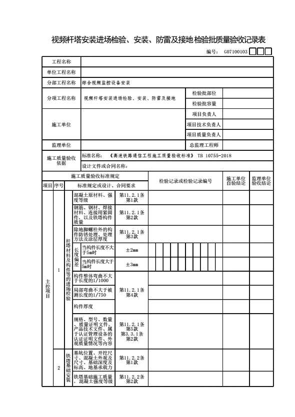表格名称:G07100103 视频杆塔安装进场检验、安装、防雷及接地检验批质量验收记录表