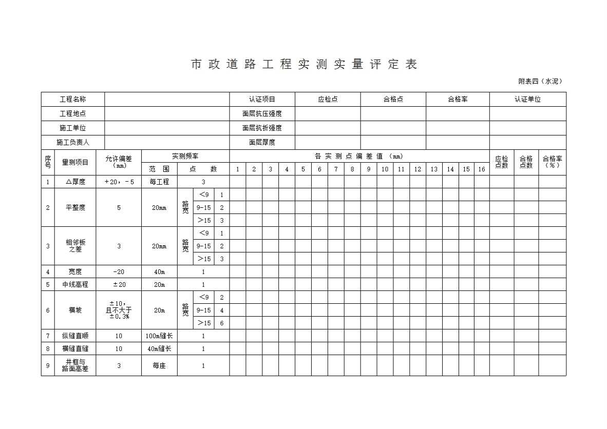 表格名称:3 市政道路工程实测实量评定表附表四(水泥)