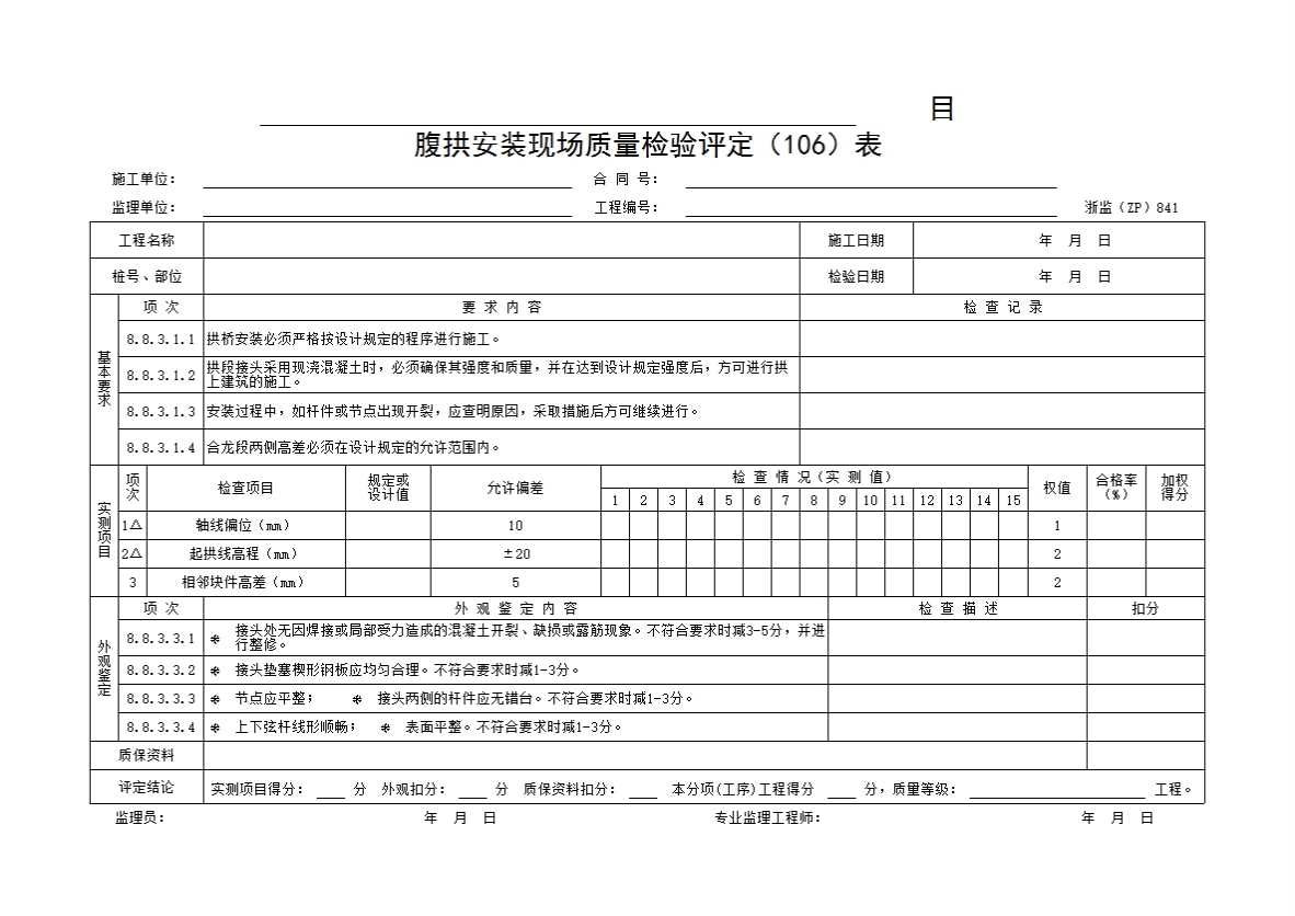 表格名称:841 腹拱安装现场质量检验(评定)表