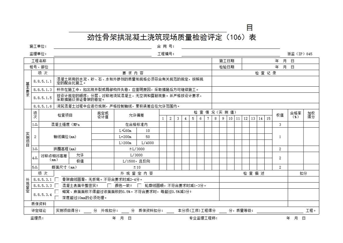 表格名称:845 劲性骨架拱混凝土浇筑现场质量检验(评定)表