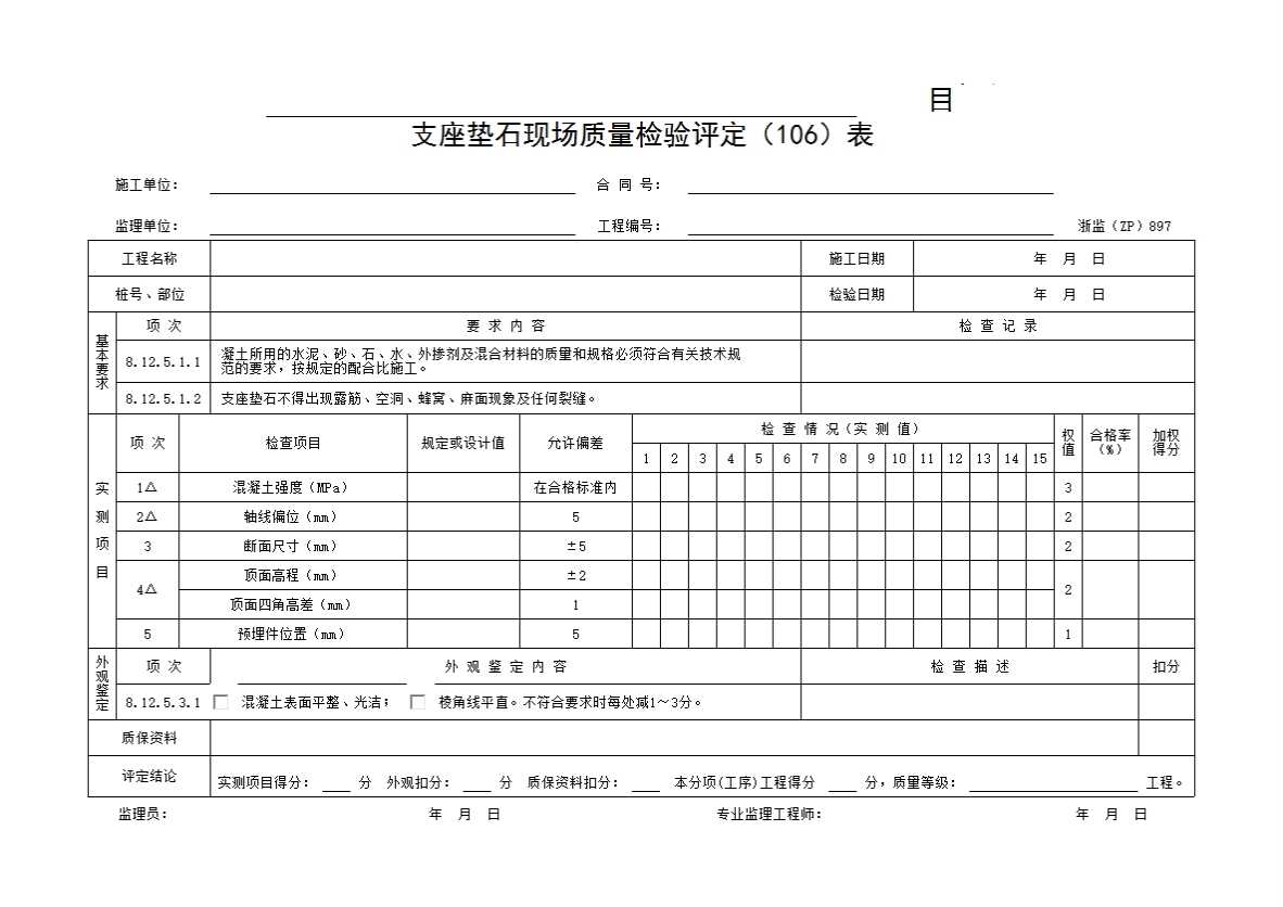 表格名称:897 支座垫石现场质量检验评定(106)表
