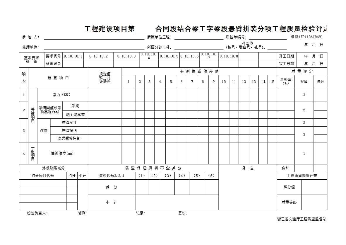 表格名称:工程建设项目第XXXX合同段结合梁工字梁段悬臂拼装分项工程质量检验评定表