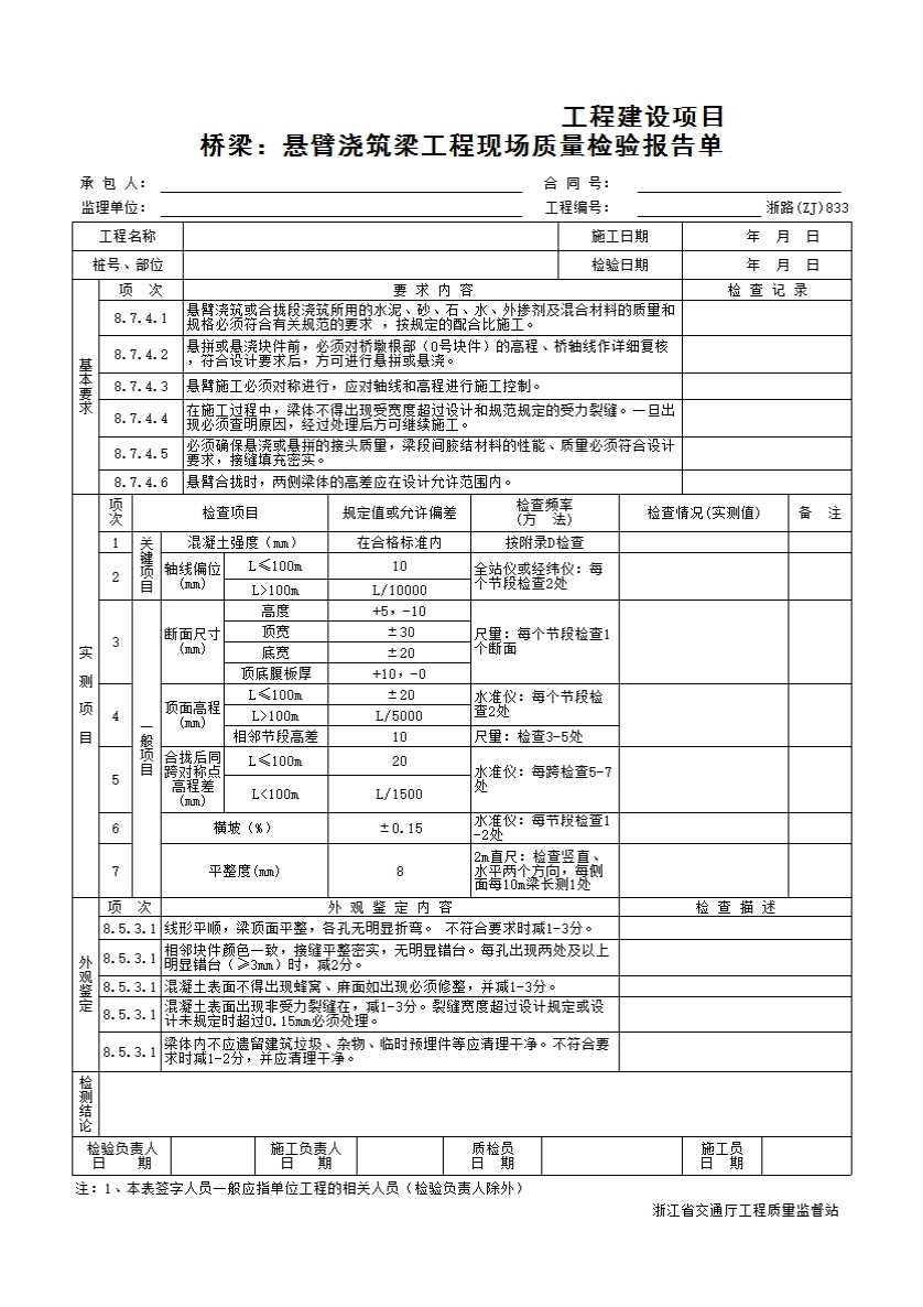 833桥梁:悬臂浇筑梁工程现场质量检验报告单