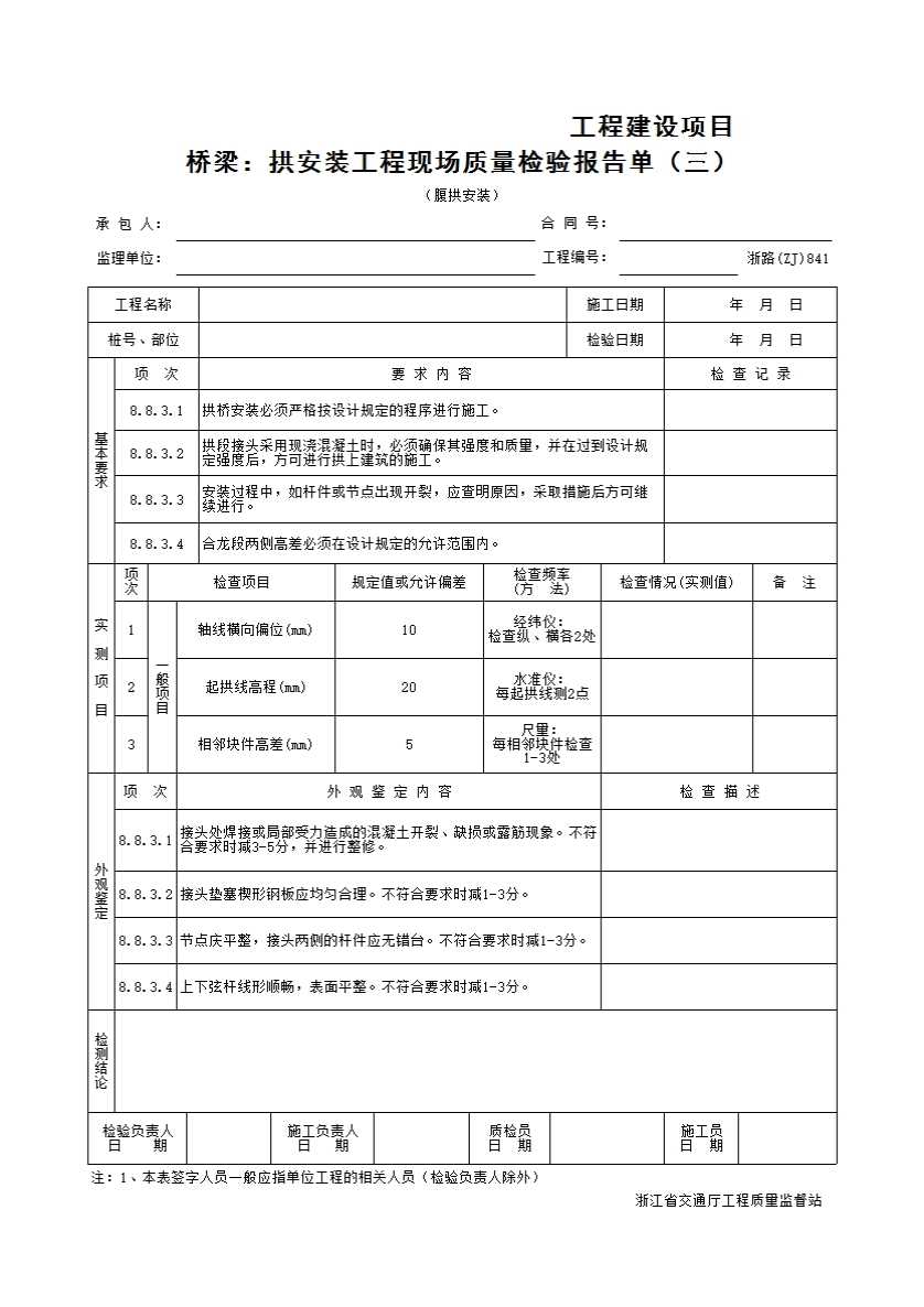 表格名称:841桥梁:拱安装工程现场质量检验报告单(三)