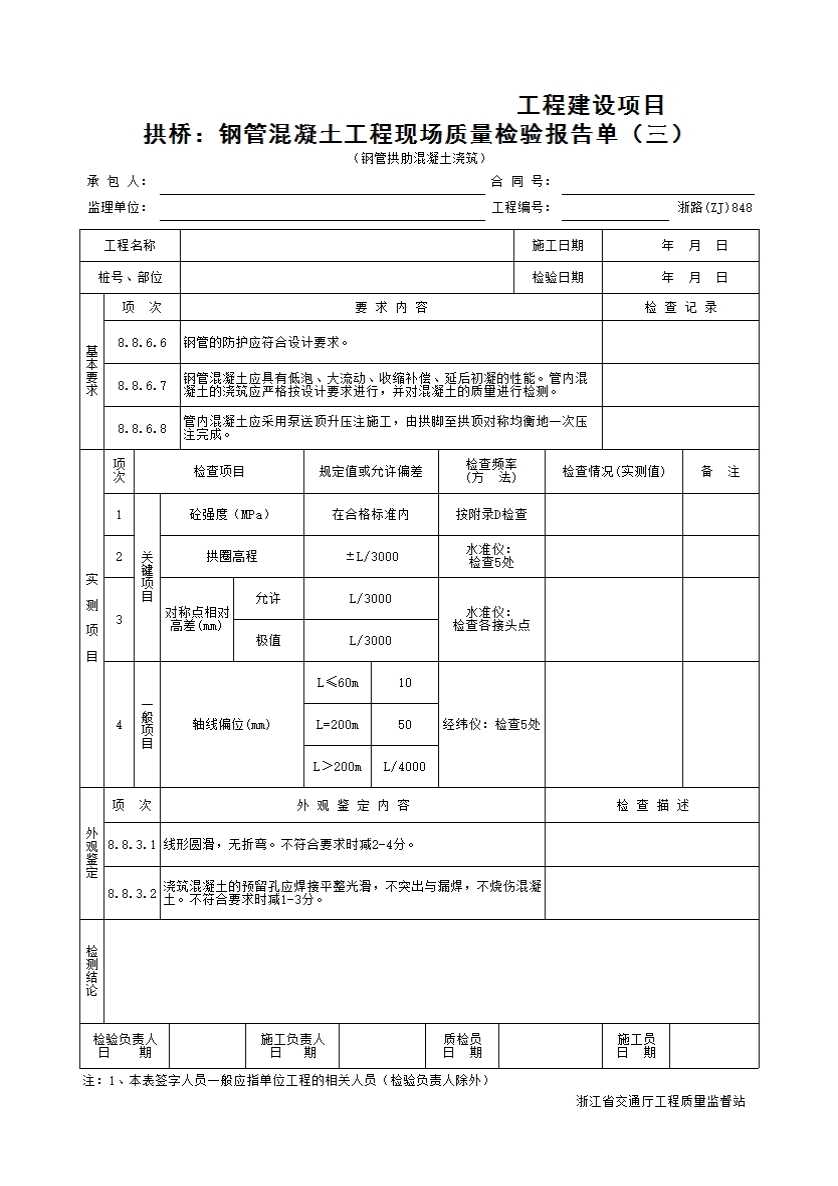 表格名称:848拱桥:钢管混凝土工程现场质量检验报告单(三)