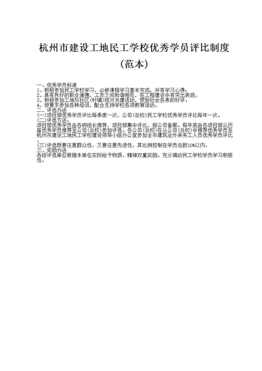 表格名称:杭州市建设工地民工学校优秀学员评比制度