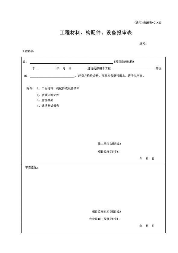 表格名称:(通用)甬统表-C1-33 工程材料、构配件、设备报审表