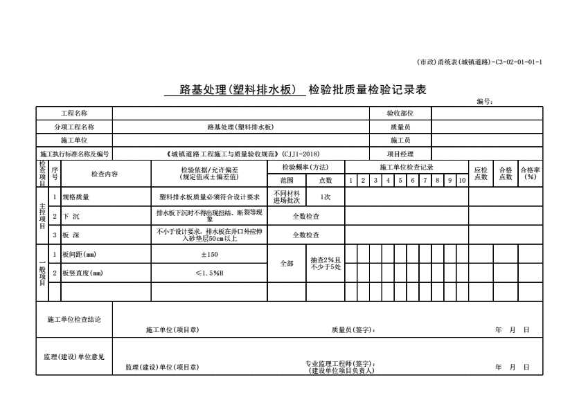 表格名称:(市政)甬统表(城镇道路)-C3-02-01-01-11 路基处理(塑料排水板)检验批质量检验记录表