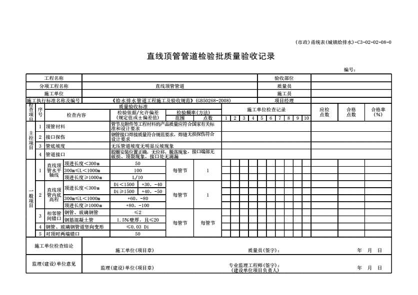 表格名称:(市政)甬统表(城镇给排水)-C3-02-02-08-01 直线顶管管道检验批质量验收记录