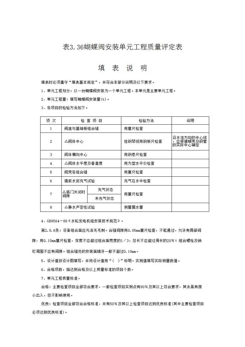 表格名称:表3.36 蝴蝶阀安装单元工程质量评定表