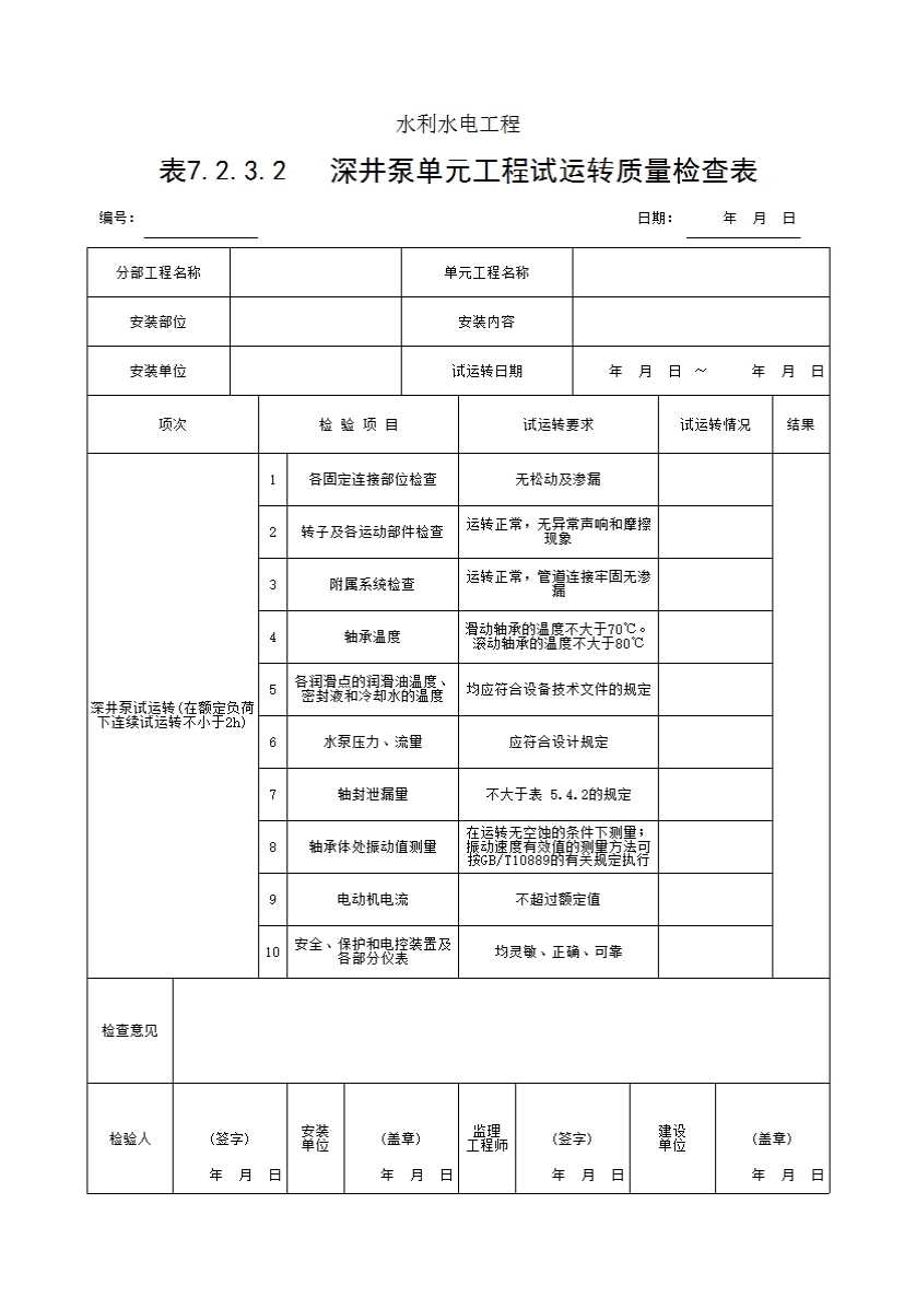 表格名称:表7.2.3.2 深井泵单元工程试运转质量检查表