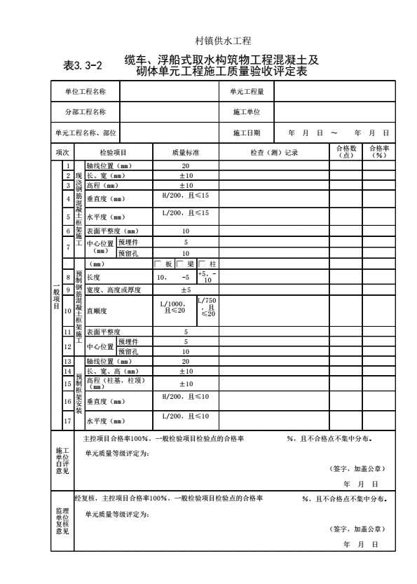 表格名称:表3.3-2 缆车、浮船式取水构筑物工程混凝土及砌体单元工程施工质量验收评定表