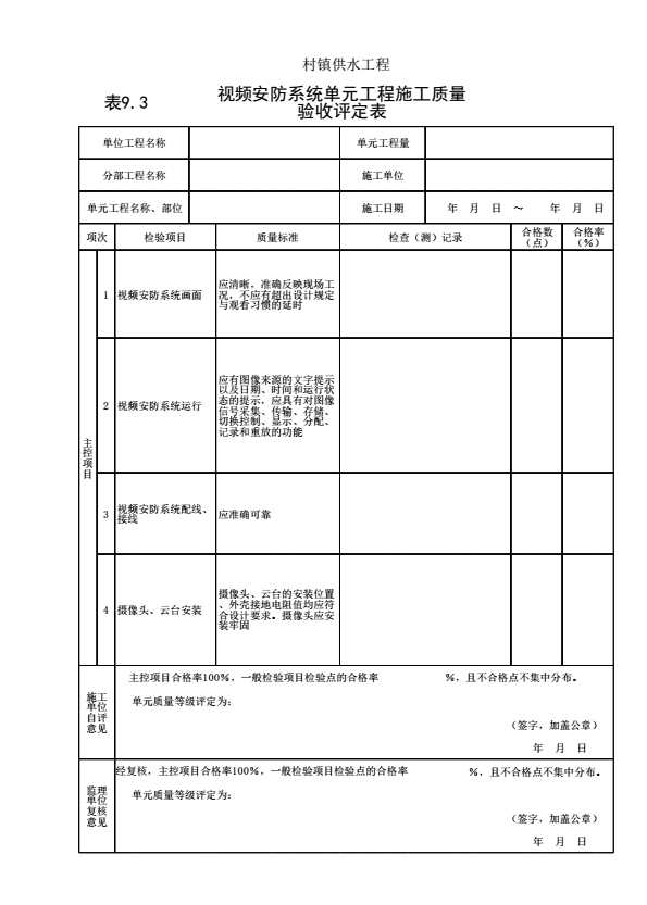 表格名称:表9.3 视频安防系统单元工程施工质量验收评定表