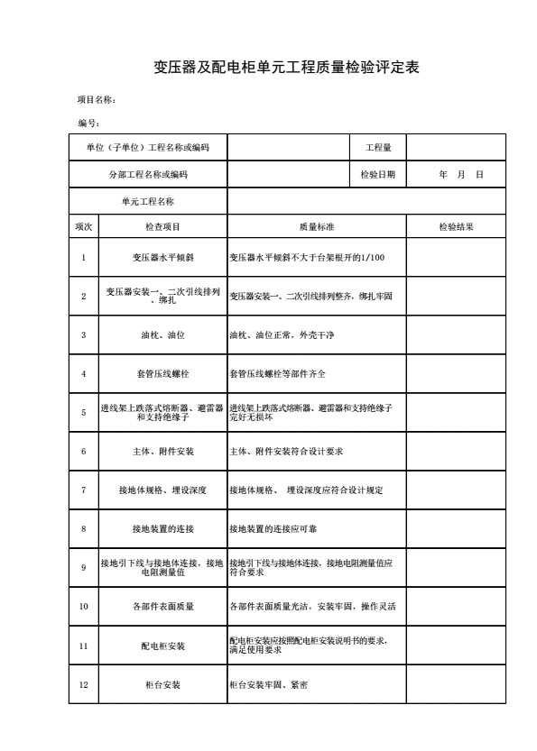 表格名称:变压器及配电柜单元工程质量检验评定表