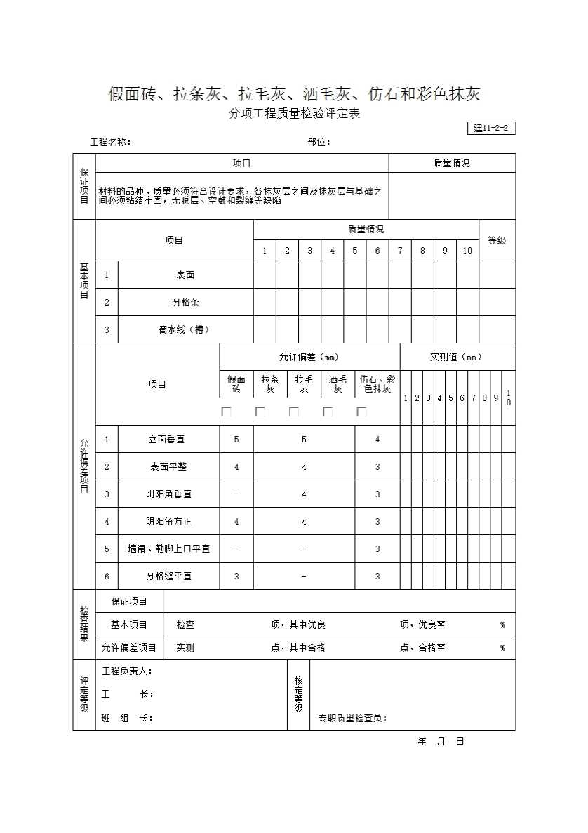 假面砖、拉条灰、拉毛灰、洒毛灰、仿石和彩色抹灰分项工程质量检验评定表
