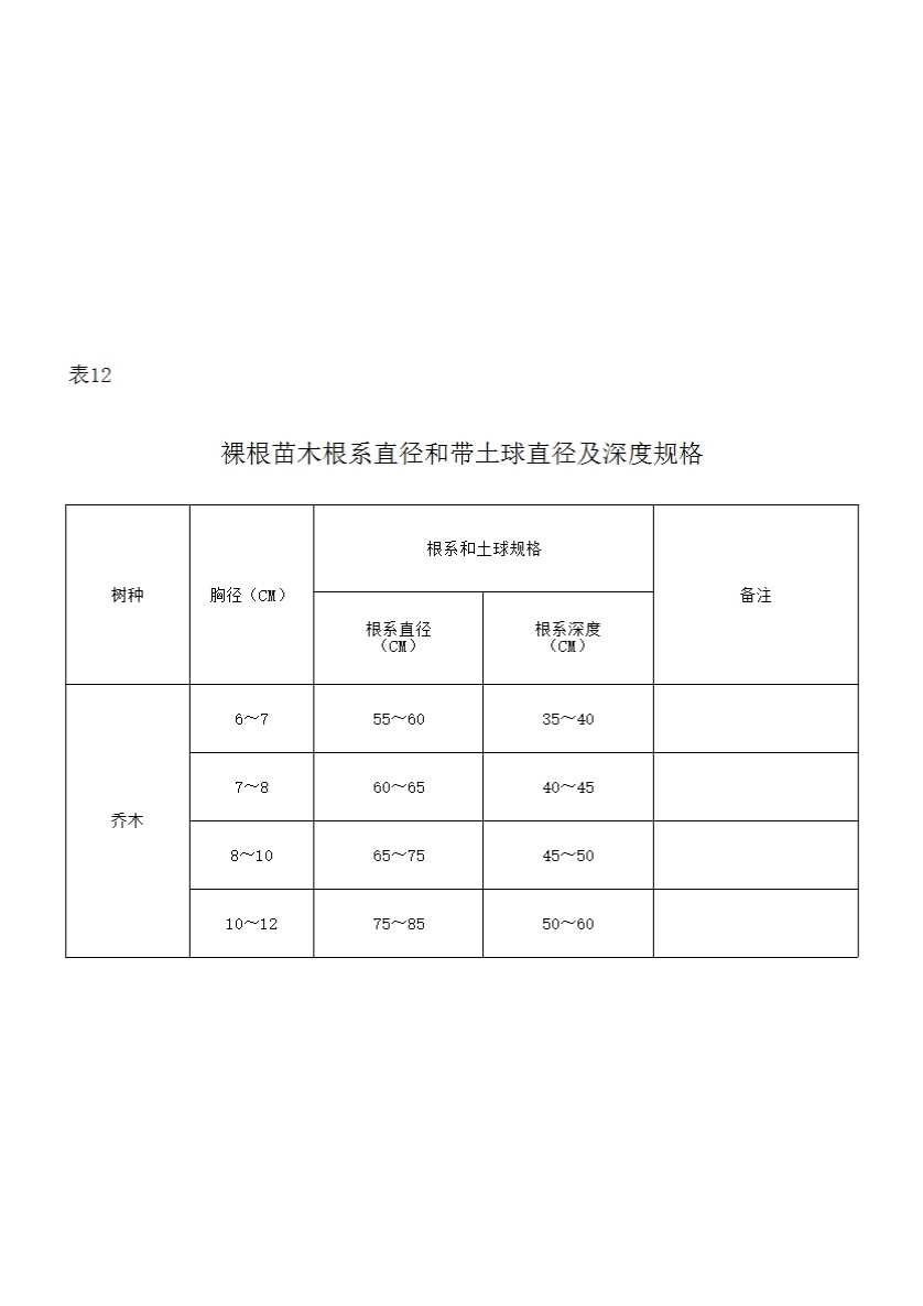 表格名称:表12 裸根苗木根系直径和带土球直径及深度规格