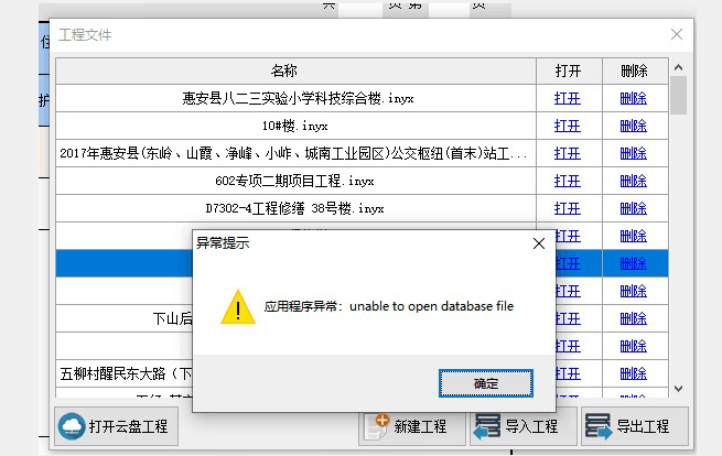 11.工程11.1单机版 11.1.5选择已做工程应用程序异常unable to open database file 把安装目录下对应的工程文件拷贝来本地,确定本地打开是否是相同异常。确认异常发研发判定是否能够修复(如工程文件拷贝不过来,建议客户换台电脑试下---安装目录在移动U盘的情况下)